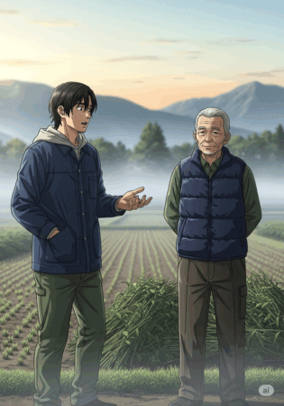 ある朝、一郎が畑で立ち尽くしていると、隣の果樹園を営む年配の男性、洋一が声をかけてきました。洋一は、まるで木々の一部であるかのように静かにそこに立っていました。一郎が「この静けさに押し潰されそうです」と零すと、洋一は穏やかに微笑みました。「孤独を空腹のように感じるのは、まだあなたが自分自身という料理を味わい尽くしていないからですよ。」