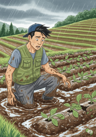 途方に暮れるタクの前に、隣の家に住むベテラン農家のゼンがやってきました。ゼンは折れた苗をそっと拾い上げ、静かに言いました。「土の相手は時間がかかる。焦らんでいい。自然が相手の仕事は、いつだって計算通りにはいかんもんさ」。