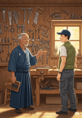 ゼンはタクを自分の家へ招き、壁に掛けられたたくさんの道具を見せました。そこには農具だけでなく、大工道具や、筆、そして古いそろばんまでありました。「『百姓』というのはな、百の仕事ができる人のことだ。農業一本で食おうと思いつめることはないんだよ。」