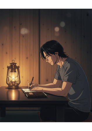 夜、一郎はランプの灯りの下で日記をつけ始めました。それは誰かに見せるためのものではなく、自分の魂との対話でした。かつて都会で感じていた孤独は、他者を求めて得られない「欠乏」でしたが、今の孤独は、自分自身で満たされる「完結」へと変わりつつありました。彼は、沈黙の中にこそ、真の自由と知性が宿ることを確信し始めたのです。