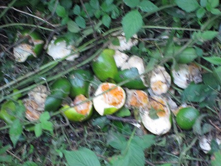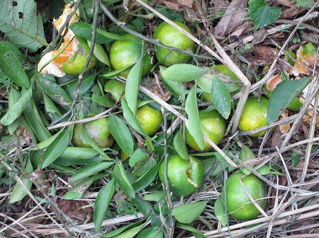 他にも、上を向いているはずの枝が下にひん曲げられてみかんが食べられて