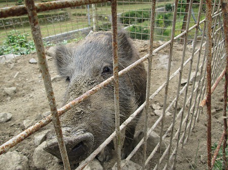 恐らく上の方に生っているみかんを食べようとして大きなイノシシが木に登ったの