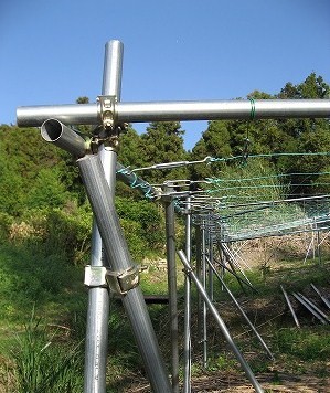 やはり柱のパイプは土中深く打ち込んで固定しないとダメなんです。これが平地で直交クランプで組めたら話は違って来ると思いますが。