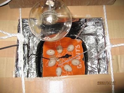 孵卵器は引っ越しで使った段ボールの内側にアルミホイルを張り、保温用のひよこ電球と40度までコントロール出来るサーモスタットをセットしました。