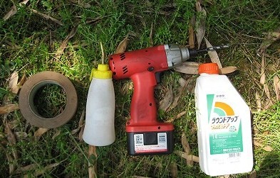 まずは、インパクトドライバーを使って竹に穴を開け、その穴に除草剤の原液を油さしを使って注入します。その後その穴をガムテープで穴を塞いで終了。