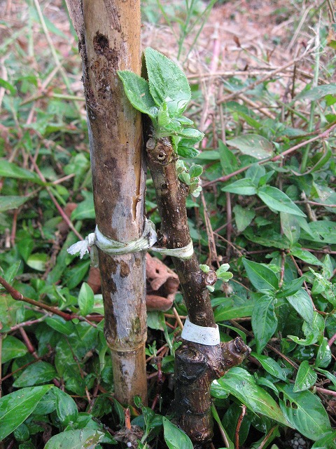実が大きくなって枝が下垂してしまったので、紐で支えてあげました。