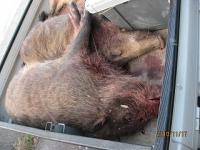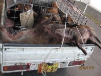 収穫が終わって、家に帰る途中イノシシを荷台に積んだ軽トラが