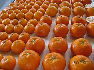 ワックスで磨き上げられた傷一つないピカピカのみかんが並んでいます。