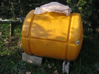 現在は使用していない、防除用のタンクに魚のアラと黒砂糖を入れて