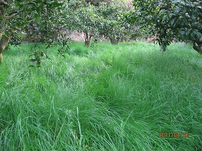 広さは約10aでご覧のようにナギナタガヤの草生栽培をしています。