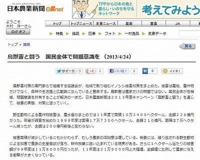 野生動物による農作物被害は、農水省のまとめでは11年度で面積10万3400ヘクタール、金額226億円だった。同省が調査を始めた1999年度は面積17万7300ヘクタール、金額210億円。面積は7万ヘクタール減ったが、金額は200億円前後と変わらない。