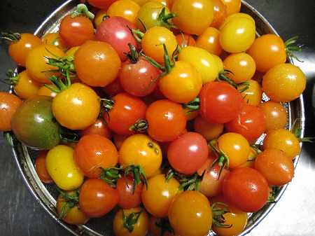 ミニトマトはスゴイ! 投稿日時: 2013-12-10 投稿者: 洋柑 返信 今年の春に初めてミニトマトの苗を5種類ほど購入して菜園に植えてみたのです。 順調に育って、夏前ころから収穫できるようになりました。 それから時が流れ。。。。 今でもご覧のように大量に収穫出来ちゃいます♪ 味も変わらず美味しいです。食べきれないのできれいなものを袋に入れて 道の駅の直売所に持って行ったら、すぐに売れちゃいました。 まだまだ沢山花をつけています。一体いつまで収穫できるのでしょうか? 来春もミニトマト植えようっと