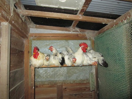 ゆ・ず・り・あ・い 投稿日時: 2013-10-02 投稿者: 洋柑 チャボのピー助一家の寝室の状況です。 上の段の止まり木は定員が6匹なのですが、先日から7匹に増えたので、 いつも夕方激しい席取り合戦が繰り返されていたんです。 詳しくは過去記事をどうぞ その1 その2 それが、今日は様子が変なんです。いつも下の段に1匹いるのに。。。。 いないんです。 数えて見ると、上の段に7匹いるんです:exclamation: 譲り合って皆で仲良く上の段で寝ることにしたようです。 これから寒くなってくるので、下の段で1匹で過ごすのは寂しいし、辛いからね。 よかったよかった。 Related posts: No related posts.
