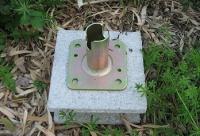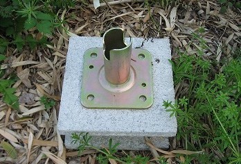 単管パイプで作る場合、キウイの実が成りだすとその重さで柱のパイプが沈んで行くとの話を聞いたので、柱のパイプの土台はベースをコンクリートブロックにコンクリートボンドで固定して土に埋めることにしました。