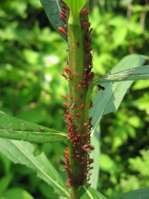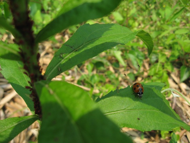 この草には、かなりの確率でナナホシテントウ虫の成虫あるいは幼虫が一匹ついているのです。写真は成虫ですね。