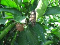 ご覧の油蝉は羽化間もなかったのでしょう。まだ飛び立つ準備ができていなかったのかツンツンと突っついても逃げません。それで記念撮影と相成りました。
