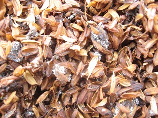 拡大してみると、鶏糞に白い菌がしっかりとまわっています。ただ籾殻