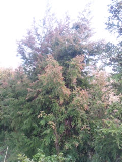 暴風林として植えてある杉の木がどういう訳か茶色く変色し