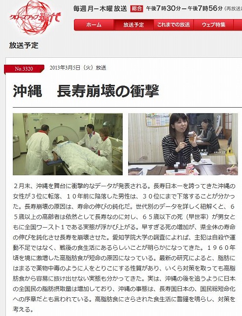 沖縄 長寿日本一女性も陥落 投稿日時: 2013-03-02 投稿者: 洋柑 来週の火曜日3/5日(火)のクローズアップ日本で放送されるそうです。 Related posts: No related posts.