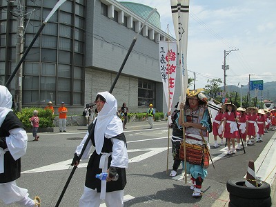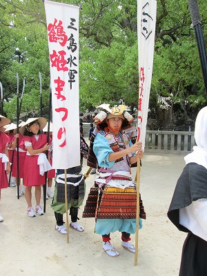 瀬戸内のジャンヌダルクと呼ばれる「鶴姫」役は、大三島にゆかりのある方を条件に、毎年公募し決定されます。その鶴姫を先頭に大山祇神社から宮浦桟橋まで約80名の武者と共に歴史絵巻のような行列が行進します。